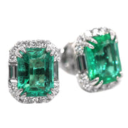 18ct White Gold Studs containing 2 emerald cut Emeralds equaling 2.24ct, surrounded by 4 G, SI baguette cut Diamonds equal to .19ct & 20 G, SI round cut Diamonds equal to .23ct.