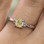 Custom made 18ct White Gold Trilogy containing a .81ct Fancy Yellow, SI2 cushion cut Diamond & 2 F, SI round cut Diamonds equal to .14ct.