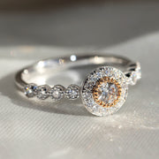 A .30ct E, SI1 Diamond surrounded by 14 Diamonds equaling to .14ct, all set into 18ct White & Rose Gold.