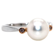 9ct White & Rose Gold Dress Ring containing a 10mm South Sea Pearl & 2 LP, SI round cut Pink Diamonds from the Argyle mine equaling .02ct, bezel set.