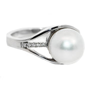 18ct White Gold split shank style Dress Ring containing a 10-11mm South Sea Pearl & 10 G, SI round cut Diamonds equaling .05ct.