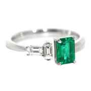 18ct White Gold asymmetrical style Dress Ring containing a .79ct emerald cut Emerald & 2 G, SI baguette cut Diamonds equal to .23ct, all claw set.