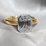18ct Yellow & White Gold Engagement Ring with a magic emerald containing 9 F, VS Diamonds equaling 1ct, all bezel set.