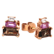 18ct Rose Gold claw set Studs containing 2 Smoky Quartz equaling .60ct, 2 Pink Sapphires equal to .384ct & 2 G, SI Diamonds equaling .06ct, all baguette cut.