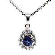 18ct White Gold Pendant containing a .37ct pear cut Sapphire & 12 G, SI round cut Diamonds equaling .17ct, bead set into a scalloped halo with a millgrain edge.