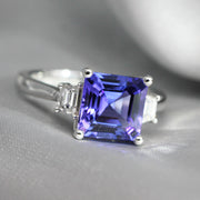 18ct White Gold Dress Ring containing a 2.99ct princess cut AAAA grade Tanzanite & 2 G, SI trapezoid cut Diamond equaling .31ct.