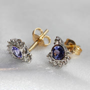 9ct White & Yellow Gold rubover set Studs containing 2 round cut Tanzanites equaling .62ct & 16 round cut Diamonds equal to .18ct in a claw setting.
