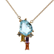 18ct Yellow Gold Necklet containing a 3.21ct abstract hexagon cut Blue Topaz, a baguette cut Yellow Sapphire, Orange Sapphire and Pink Sapphire equaling .32ct & 2 G, SI round cut Diamonds equaling .07ct, all claw set & attached to a 45cm trace Chain.