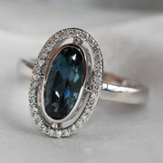 9ct White Gold Dress Ring containing a 1.58ct London Blue Topaz & 34 J, SI round cut Diamonds equal to .17ct.