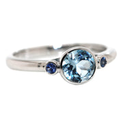9ct White Gold Trilogy containing a 6mm round cut Blue Topaz & 2 round cut 2mm Ceylon Sapphires bezel set.