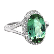 18ct White Gold Dress Ring containing a 3.09ct oval cut Mint Tourmaline, surrounded by 150 G, SI round cut Diamonds equaling .76ct, all set pave and grain set into the halo and shank.