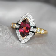 18ct Yellow, White & Rose Gold Dress Ring containing a 1.2ct marquise cut Pink Tourmaline, 24 round cut H, SI Diamonds equal to .45ct & black enamel.