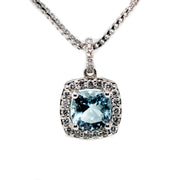 18ct White Gold claw set Pendant containing a .88ct cushion cut Aquamarine & 23 G, SI round cut Diamonds equaling .21ct in the halo.