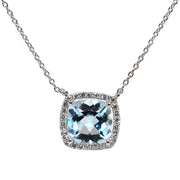 18ct White Gold Necklet containing a 2.78ct cushion cut Aquamarine, surrounded by 26 G, SI round cut Diamonds equaling .25ct, attached to a 45cm Trace Chain.