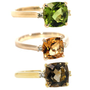 Crafted in 9ct Gold, this exquisite dress ring showcases a cushion cut Gemstone, flanked by a delicate J, SI round cut Diamond on either side in a classic claw setting equaling .04ct. Its sleek, modern design makes it a versatile statement piece.