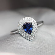 18ct White Gold Dress Ring containing a .84ct pear cut Ceylon Sapphire & 44 F, SI round cut Diamonds equal to .328ct, micro set into the halo.