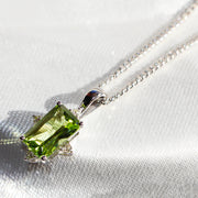 9ct White Gold claw set Pendant containing a 1.24ct radiant cut Peridot & 4 J, SI round cut Diamonds equaling .04ct.