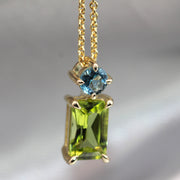 9ct Yellow Gold Pendant containing a 1.24ct emerald cut Peridot & .30ct round cut Blue Topaz, all claw set.