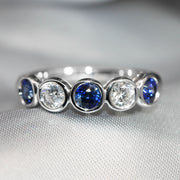 18ct White Gold bezel set Band containing 3 round cut Ceylon Sapphires equaling .75ct & 2 F, SI round cut Diamonds equal to .358ct.